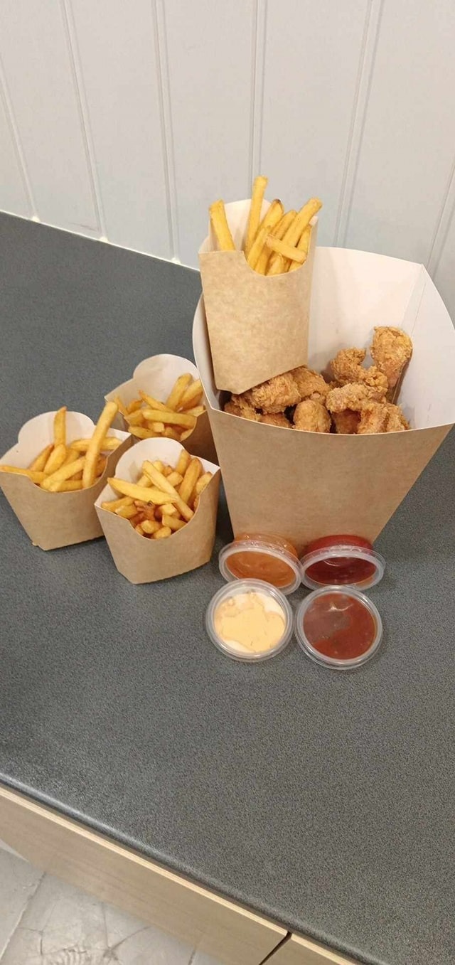 30 strips ( 900g) + 4 porcje frytek (400g) + 4 sosy gratis