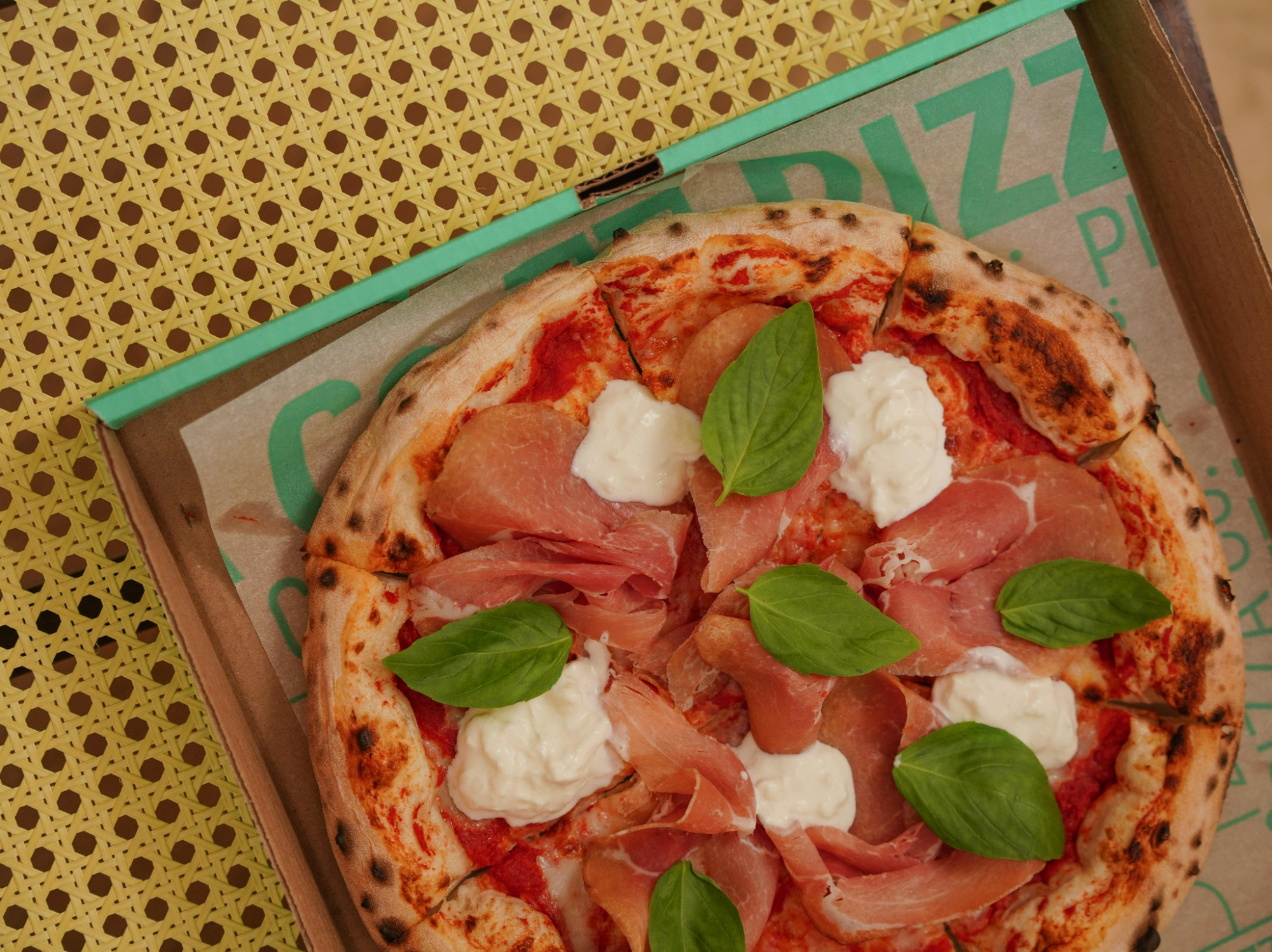 szynka parmeńska, czerwona cebula, pomidorki cherry, świeżą bazylia -